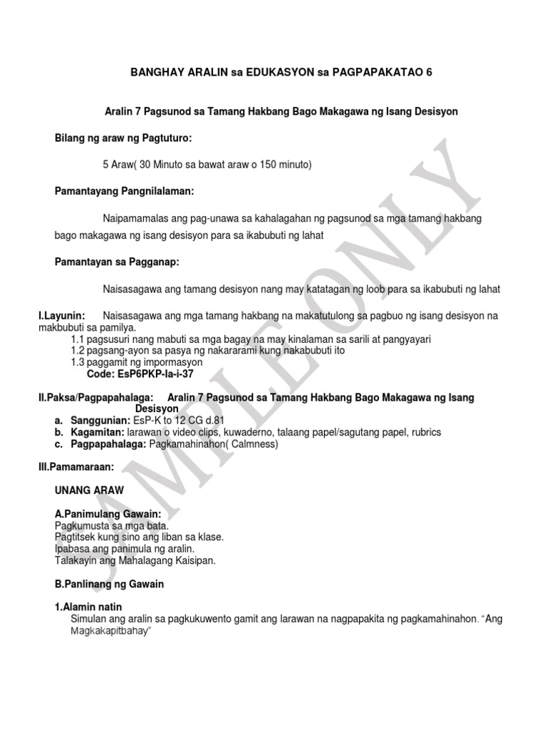 Pamantayang Pangnilalaman Naipamamalas ang pag-unawa sa kahalagahan ng pagsunod sa mga tamang hakbang bago makagawa ng isang desisyon para sa ikabubuti ng lahat B. 1 Unlock answers Other questions about. Edukasyon sa Pagpapakatao.